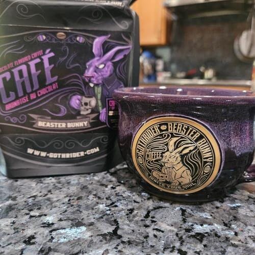 Indulge in a cozy cup of hot chocolate, coffee, or tea with the Beaster Bunny Limited Edition Deneen Pottery Mug — a handcrafted masterpiece designed for true GothRider collectors.