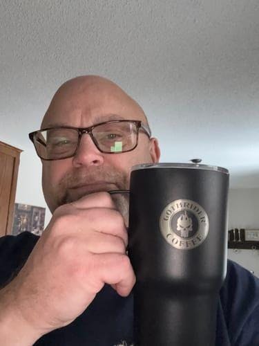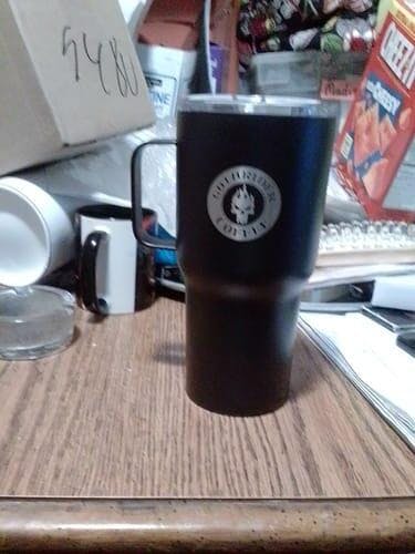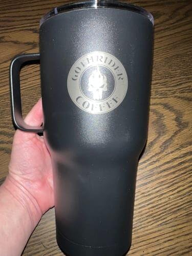 This is a high-quality Vacuum Sealed 30oz Tumbler with the unique GothRider® Coffee laser etched Design on it.