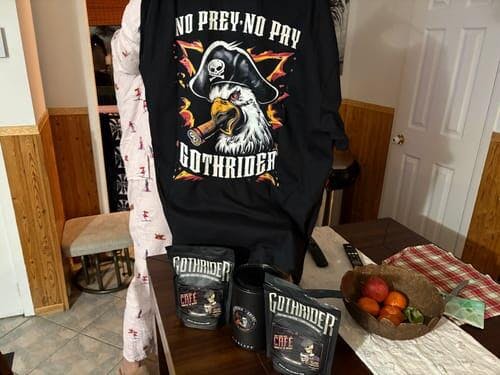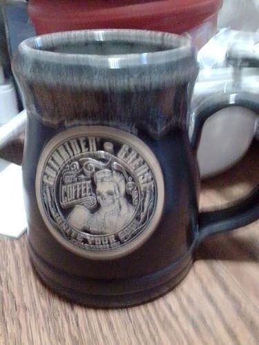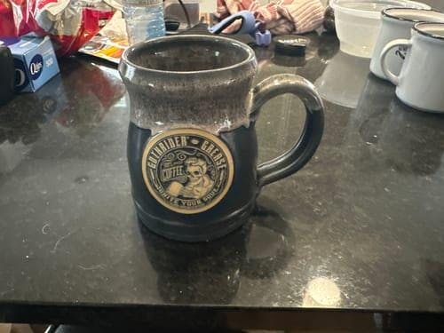 Part of our 2022 collectible mug series, this is the original GothRider® Grease™ Tankard Limited Edition Mug signed by Niles made by Deneen Pottery Maker which holds 22-plus ounces and is in matte black and sand white glaze. (300 were made and signed)