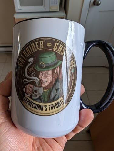 Add a splash of color to your morning coffee or tea ritual! This GothRider® Leprechaun's Favorite mug is not only have a beautiful design on it, but also a colorful rim, handle, and inside, so the mug is bound to spice up your mug rack.
