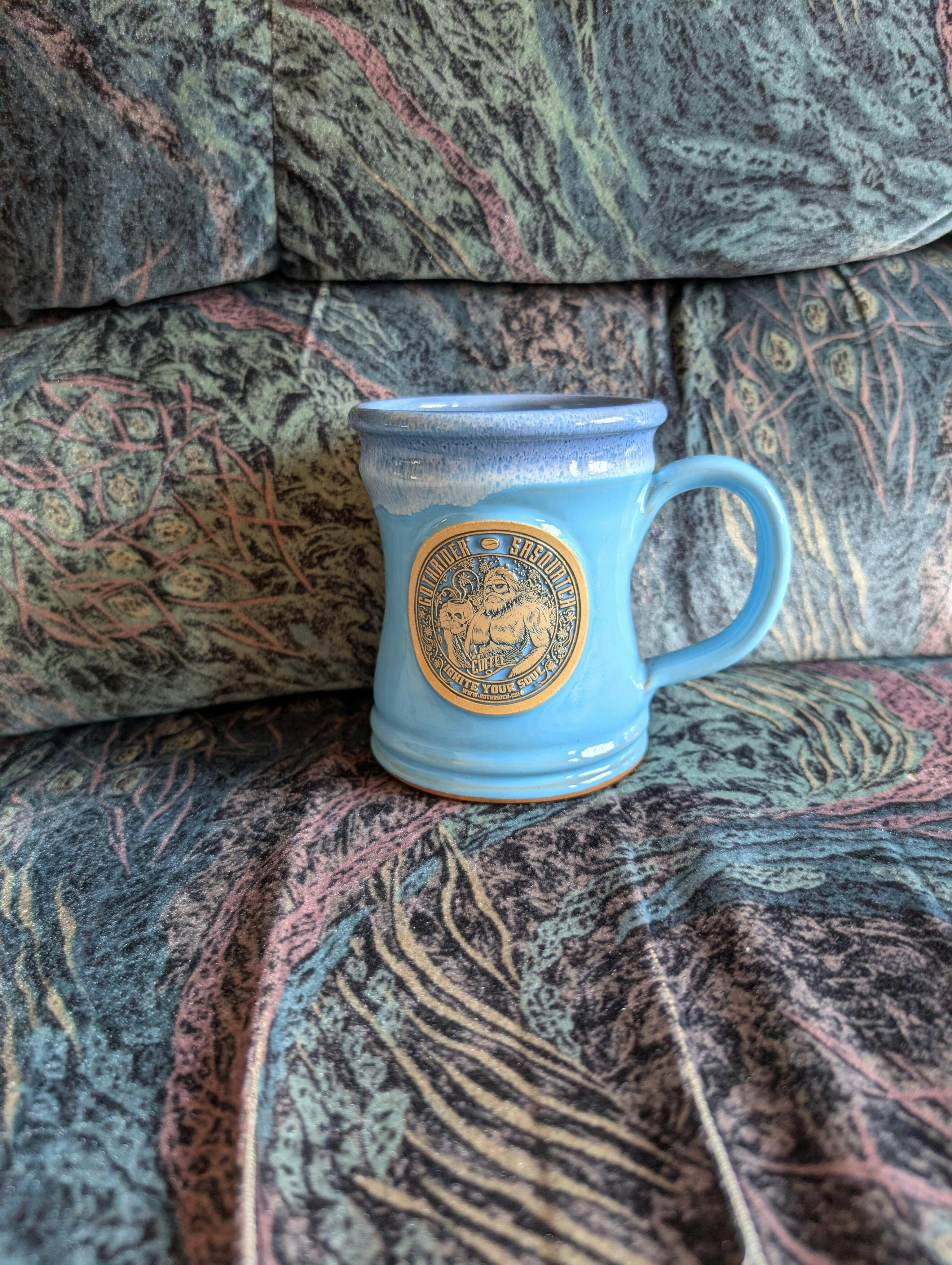Emerging from the shadows in a mysterious Powdered Blue & Blue White glaze, the Sasquatch Limited Edition Deneen Pottery Mug is your rarest coffee companion yet. Crafted in the iconic Judge shape, this rugged stoneware relic bears the unmistakable GothRider Sasquatch Coffee medallion, a symbol of strength, mystery, and morning power. Whether you're venturing into the woods or just braving the day ahead, this mug is built to be your legendary sidekick.