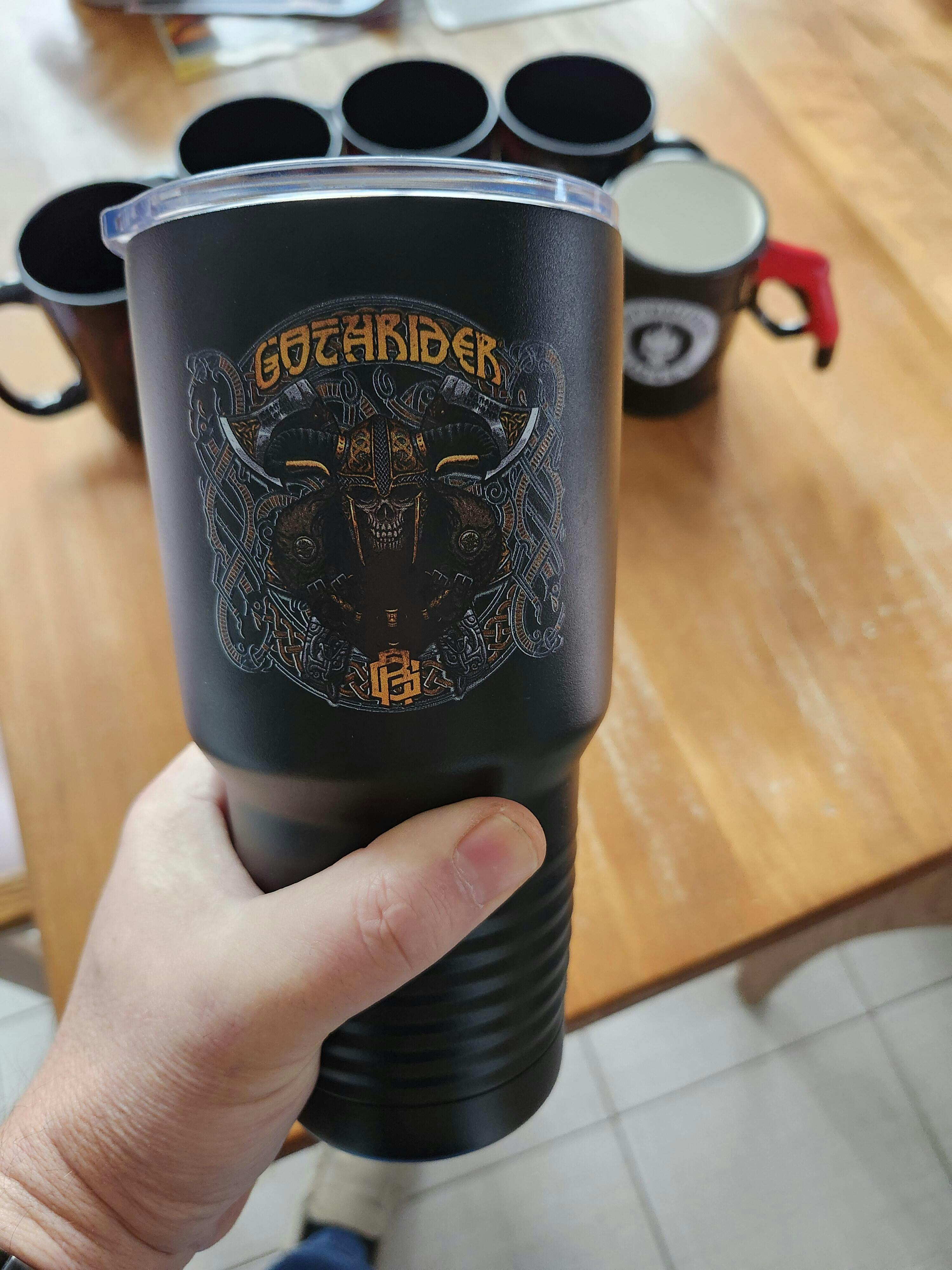 This is a high-quality Vacuum Sealed 30 oz Tumbler with the unique GothRider® Viking Axeman Design on it.